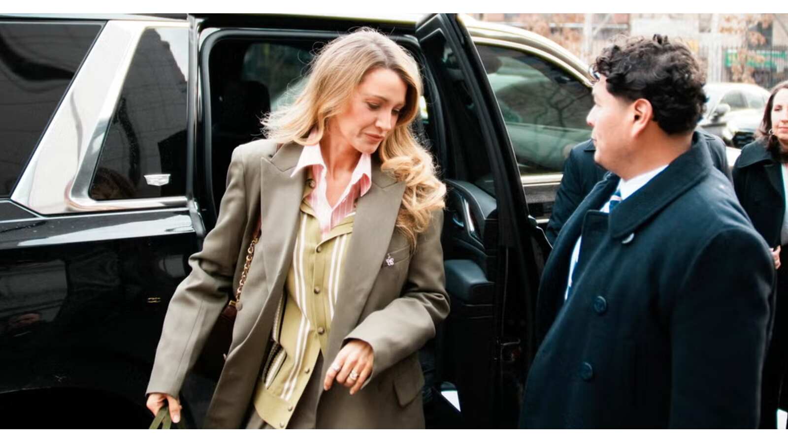 Lively, 38, wore an olive green suit paired with a pale pink collared shirt. Baldoni, 42, arrived in a long olive green wool coat and styled it with a pale pink scarf. The coordinated color palette did not go unnoticed by onlookers or fans online.