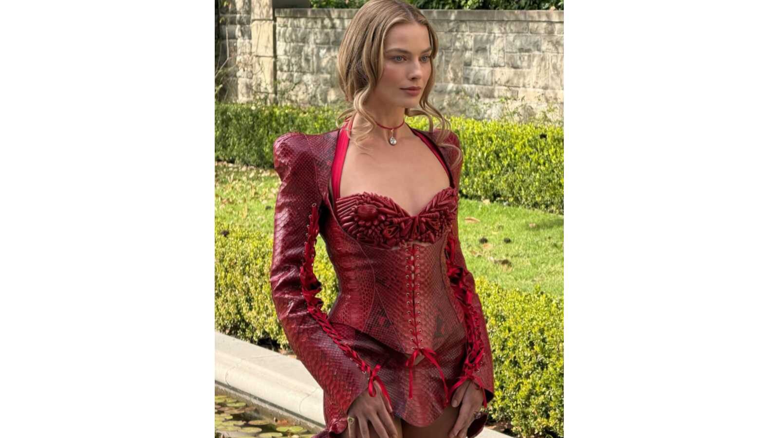 Robbie stunned in a form-fitting Schiaparelli gown featuring a nude lace bodice that flowed into a dramatic black and red train. The train resembled blooming petals and added a theatrical touch to the look.